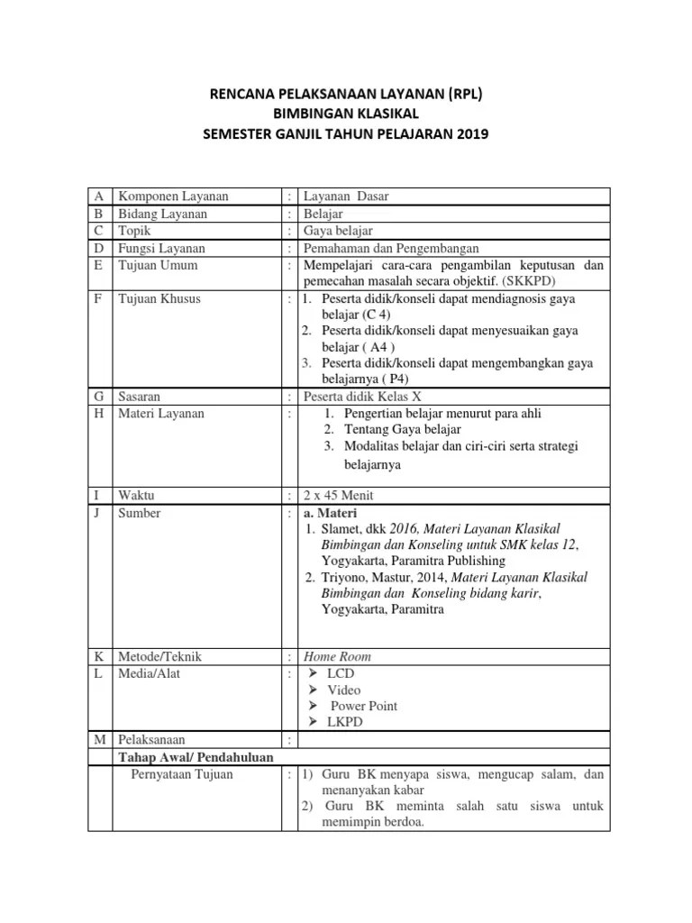 Membantu peserta didik memahami karier/ serta mengenal kemampuan bakat dan minat serta arah kecenderungan karir 2. Mengenali bakat dan minat demi suksesnya karir 2. Rencana pelaksanaan layanan (rpl) bimbingan klasikal semester genap tahun pelajaran 2020/2021 nama satuan pendidikan : Smk n 1 karanganyar komponen : Kaliurang km 10, gadingan no.333 sinduharjo ngaglik sleman yogyakarta 55581 rencana pelaksanaan layanan (rpl) bimbingan klasikal semester ganjil tahun pelajaran 2017/2018 a komponen layanan dasar b bidanglayanan karir c topik / tema layanan tipsmemilihjurusandi perguruantinggi d fungsi.
